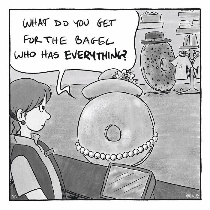 Quickies Comic covers a wide array of themes. Brandon explained how they select topics.“Honestly, most of it comes from my life. We’ve been doing this comic for three years and I’ve trained my brain to notice moments throughout the day that might make a good comic. From there, I text Joey the basic idea - the poor guy gets texts from me at all hours of the day. The challenge of telling a full joke in a single panel is finding the simplest version of the joke - and that’s always the funniest,” wrote Brandon.