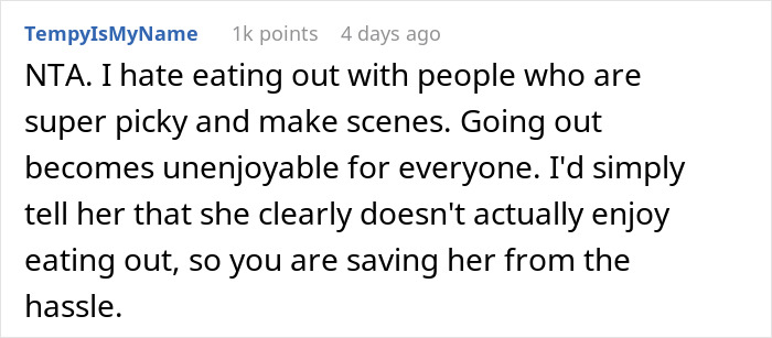 She even went as far as to say that the woman has become “an embarrassment” at the table because of her extremely selective preferences and that it made her stop inviting her to family get-togethers.