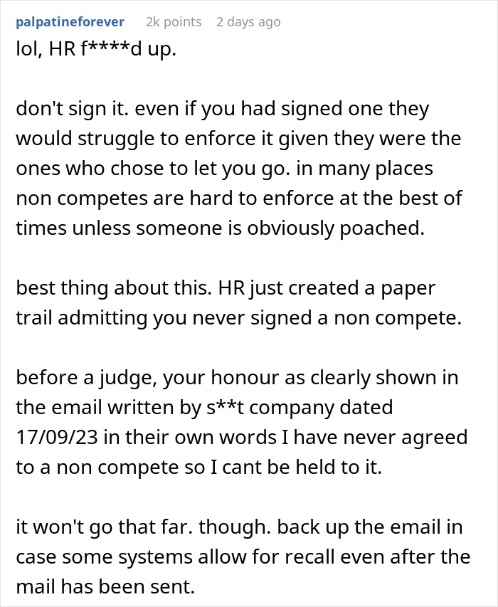 Not only that, but their former employer is trying tointimidate theminto signing a non-compete agreement after they’ve already started working elsewhere. The redditor turned to the internet for some advice and many folks were happy to help. Scroll down for the full story.Bored Pandahas reached out to u/WhitePinoy via Reddit, and we’ll update the article as soon as we hear back from them.