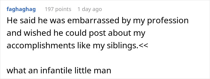 In a recent interview withBored Panda, the OP revealed that she already didn’t have a great relationship with her father, and the arguments about her career choice didn’t make it any better. “The most upsetting part of the situation was that my dad didn’t seem to care about how much he was damaging our relationship,” she said.
