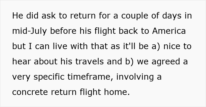 The poster explained that her American friend had planned to stay with her for 2 weeks, after which he would be going on a European trip with his girlfriend