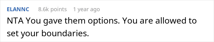 “We started arguing so I just left and went home and had a relaxing night. My mom said I should have just done it because they were in a bind but I gave them options and they vetoed all of them so I stuck to my boundary,” the OP explained to the readers on the AITA subreddit.