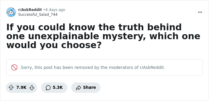 If this counts, what alien life/civilization is actually like. not whether or not it exists, but what it is like given it exists. I want to know about CULTURE, man. alien anthropology and sociology.but if that doesn’t count and it has to be a more straightforward mystery…well, does “unexplainable” mean literally nobody on earth knows? or just for most of we can only rely on theories. because then I want to say “info about aliens from area 51” or “what’s in area 51” but if that’s still breaking the rules because obviously the higher ups can explain that…then i’ll finally say “What really started the universe, the actual origin point” and blow my mind trying to comprehend infinity. or find out there actually is some kind of deity.
