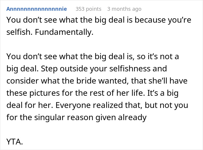 Coming back to the original story, the post received 8.3K upvotes and Redditors judged the woman to be a jerk in this situation, commenting that “wearing black” doesn’t usually mean as long as the base is black “anything goes”, especially when it is meant to make the bride stand out.