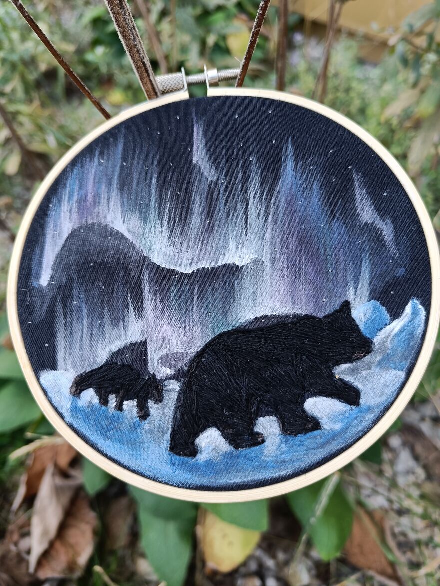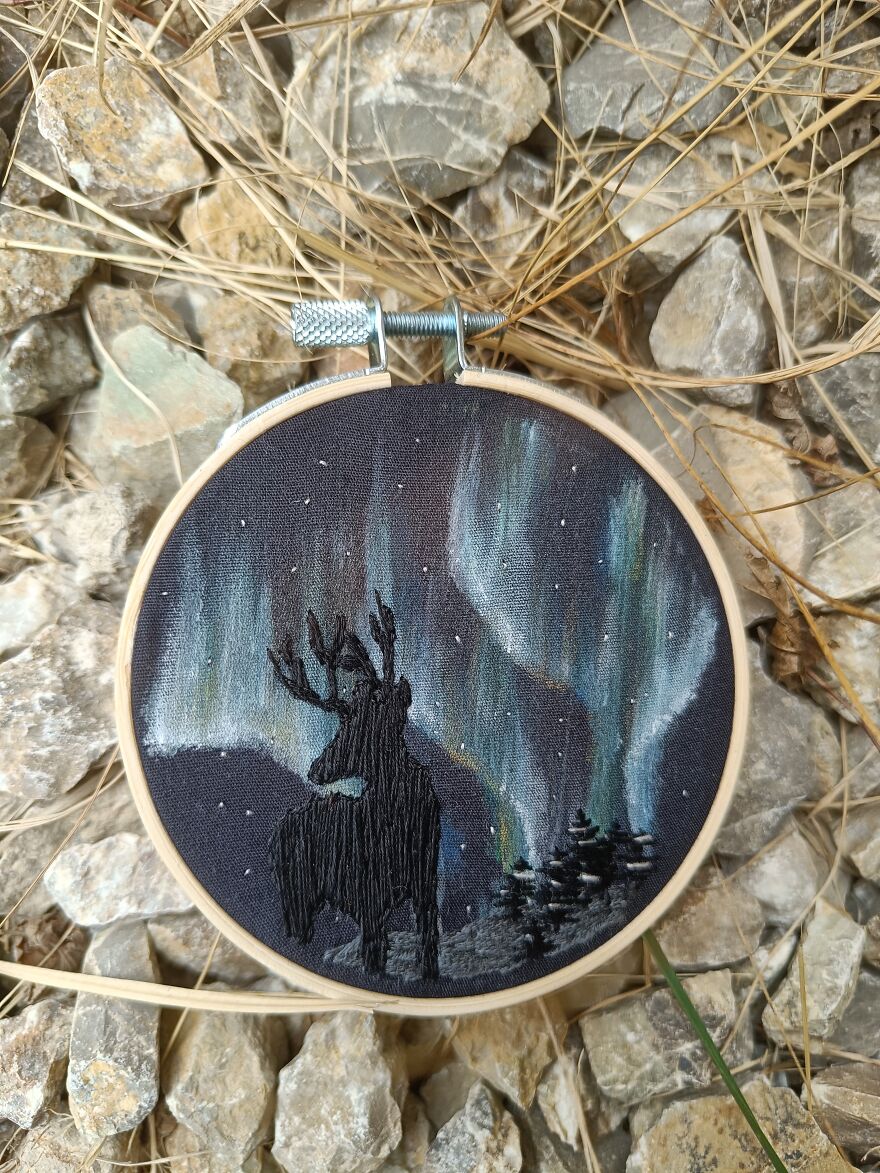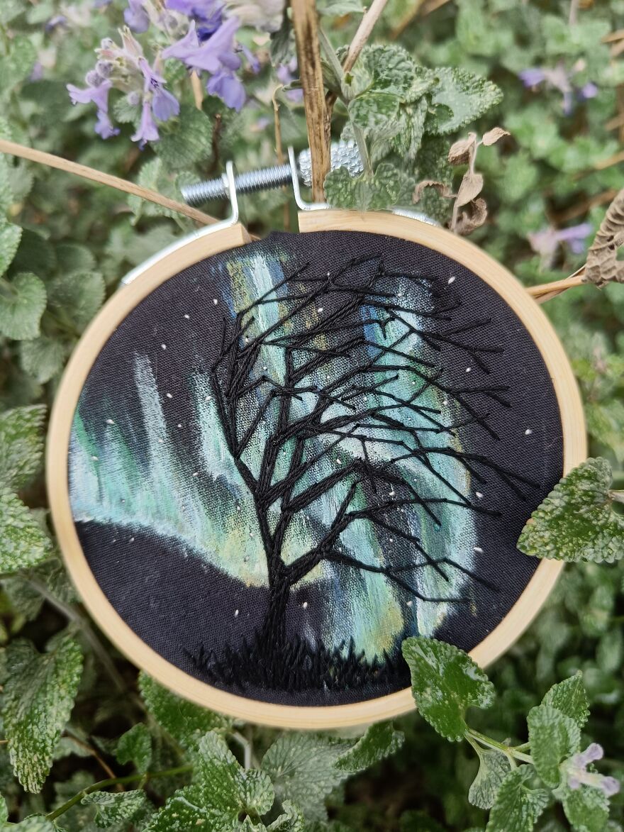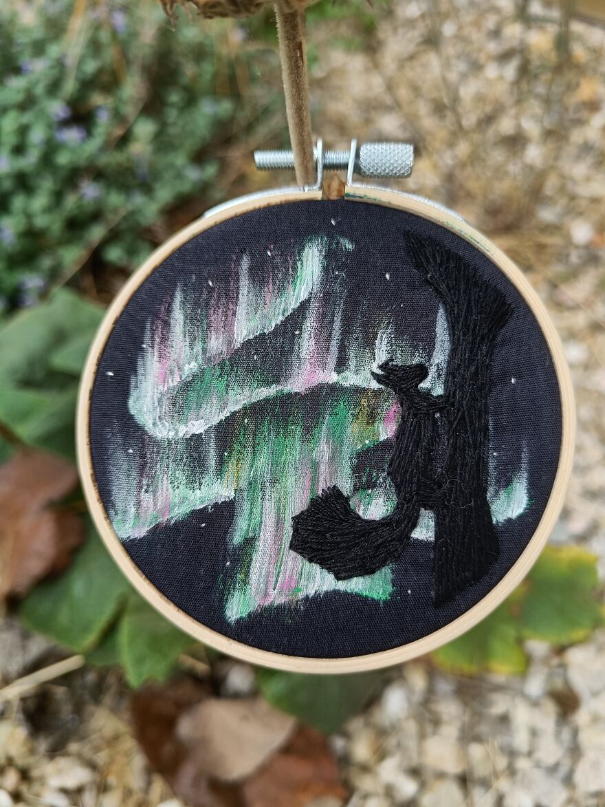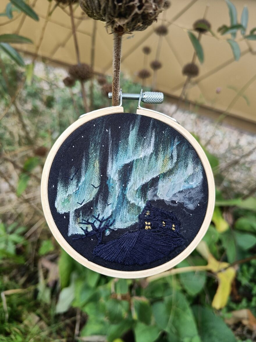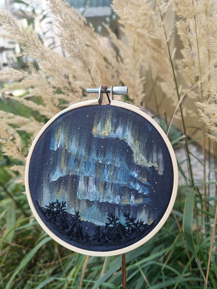 Painting was fairly new to me. In the beginning, I used regular painting canvases, adding embroidery after painting. It worked, but the canvas fabric didn’t allow for fine embroidery details. Through trial and error, I soon discovered that tensioning the fabric in an embroidery hoop makes for a great canvas! With some good acrylic paints and a range of brushes (the aurora effect really changes depending on what kind of brush is used) and lots of experimenting and practice, I started seeing these gorgeous auroras taking shape!
