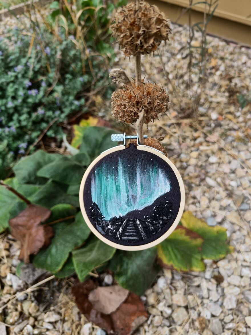 After becoming a mom, I needed to find a creative outlet. Embroidery was my savior. It’s something that can be done in between feedings, snuggles, walks, and naps. Over time, I experimented with mixed media, eventually finding my way to these embroidery art aurora borealis pieces!