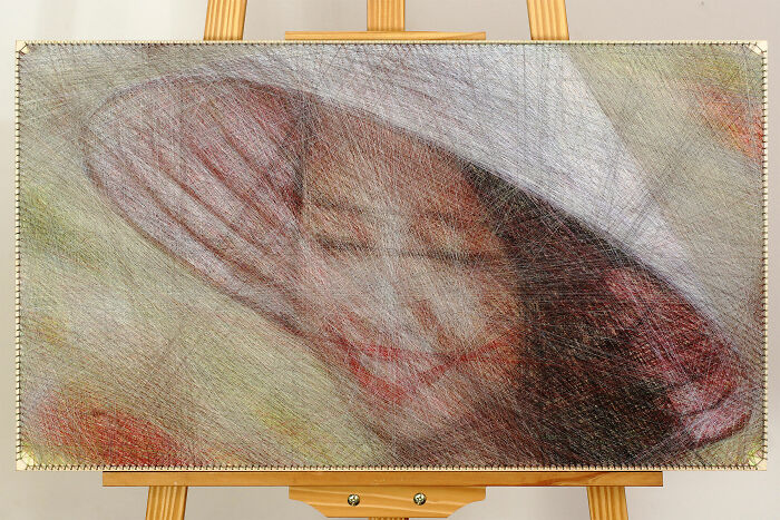 An interesting feature of this innovative technique is the unusual way in which the viewer perceives the image. The more distance one looks at the picture, the more details one sees. The distance makes the shape emerge more and more clearly from the seeming chaos of crossing threads.